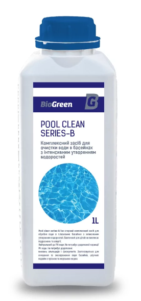 Pool clean series-В без хлорного універсального рідкого засобу для комплексної обробки води в плавальних басейнах з інтенсивним утворенням водоростей. Безпечний для дітей не викликає подразнення та алергії. Нейтральний до РН. Безпечний для людей та тварин. Не має подразнювального впливу на органи дихання. Не дратує слизову та шкіру. Не утворює у воді та повітрі токсичні сполуки. Не викликає корозію металів та руйнування інших поверхонь. Безпечний під час обслуговування басейнів.
